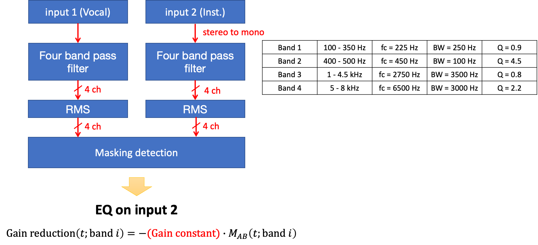 Gain reduction for each band uses a peak filter centered at fc and the Q factor of the corresponding bandwidth.